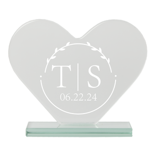 Récompense en verre en forme de cœur gravée sur mesure avec monogramme de couple encerclé et date