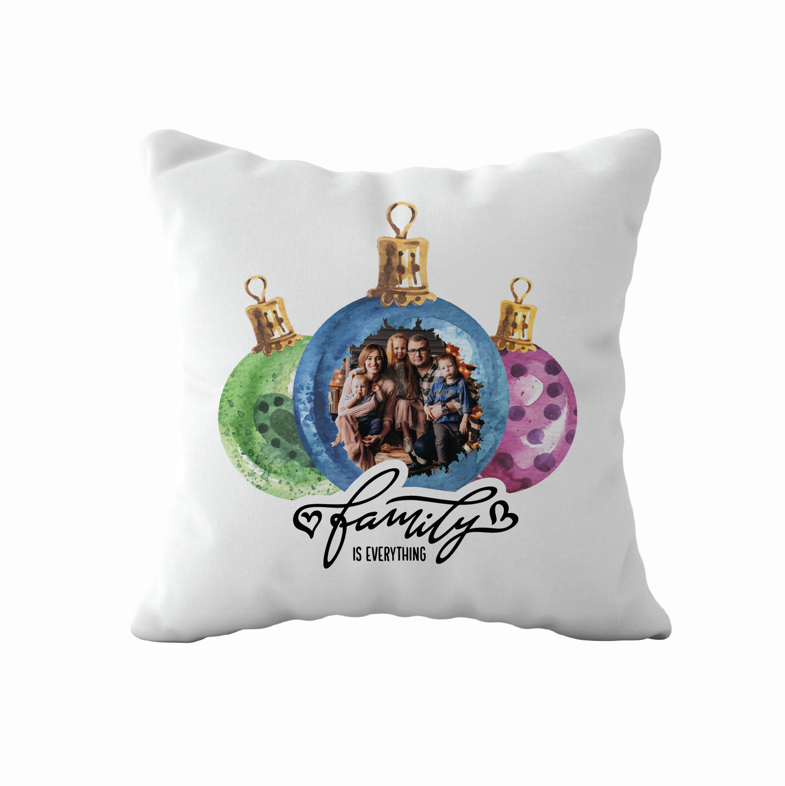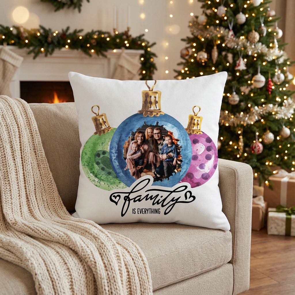 Add warmth and personality to your home decor with this charming 18 x 18 inch throw pillow. Featuring a beautiful watercolor Christmas ball design, it beautifully captures the festive spirit. The pillow can be personalized with a favorite family photo, making it a truly special keepsake. Beneath the design, the heartfelt saying "Family is Everything" reminds everyone of the importance of loved ones during the holiday season. Perfect for your sofa, bed, or as a thoughtful gift, this cozy pillow brings both comfort and personal meaning to your holiday decorating.