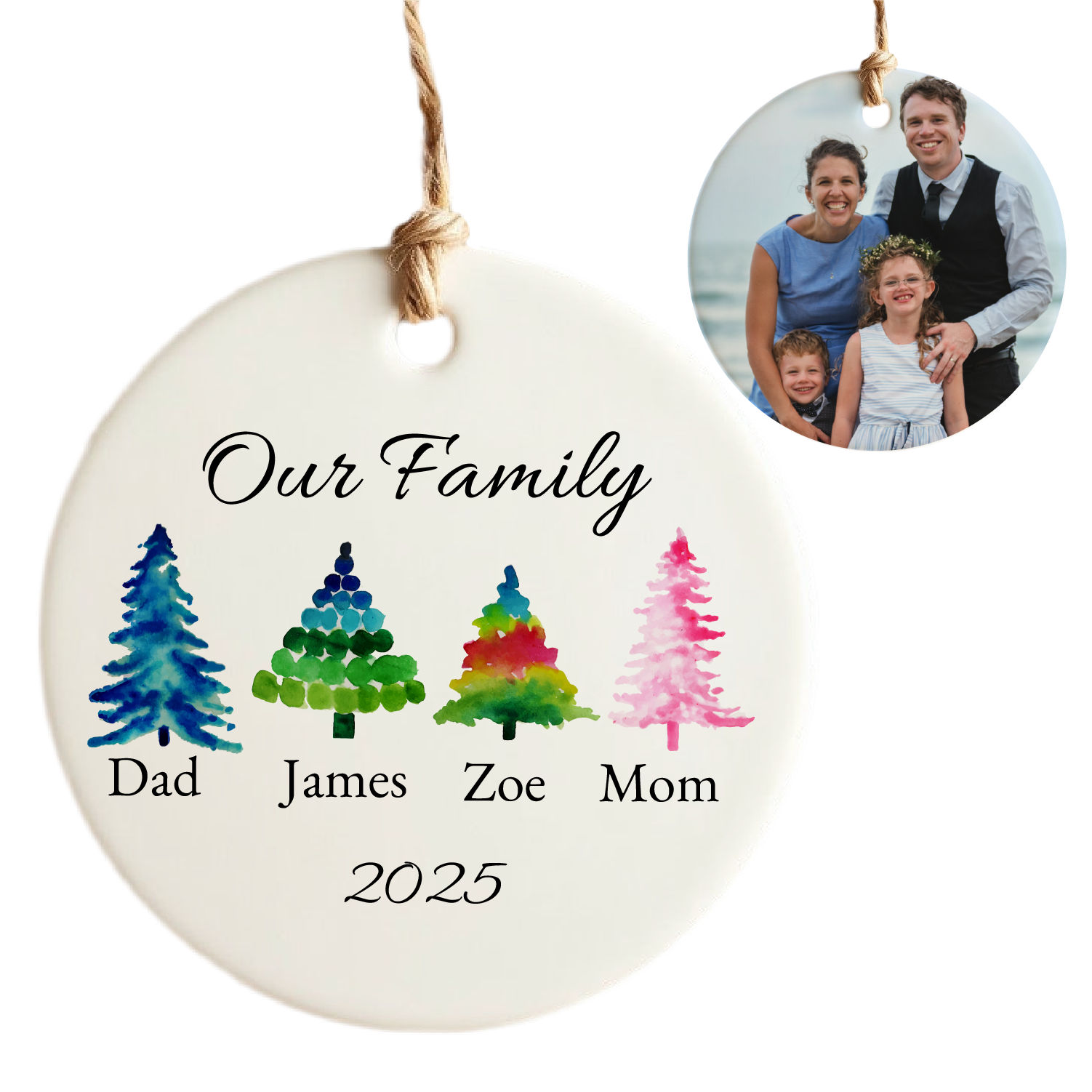 The other side of the ornament offers space for a favorite family photo, which can be uploaded and printed with vibrant clarity. This side captures a precious moment or beloved image, adding a warm, personal touch to holiday décor. Perfect as a memorable keepsake, this ornament can be customized to create a unique and meaningful addition to any Christmas tree, celebrating both individual family members and treasured memories.
