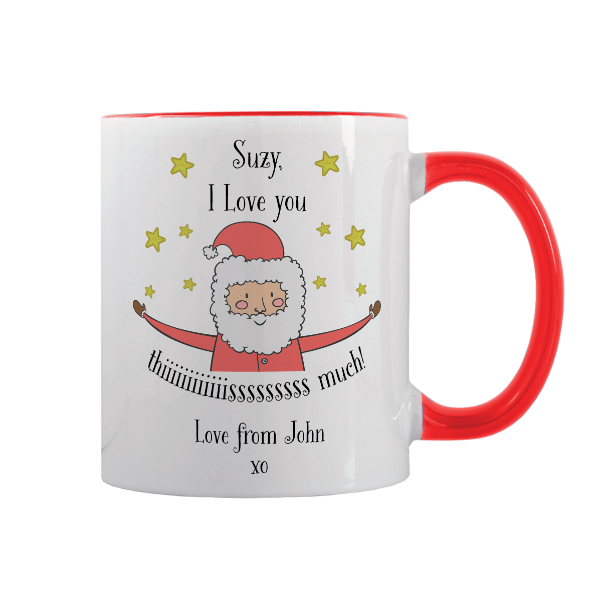 Start your day with holiday cheer and a touch of fun with this charming white 11 oz coffee mug featuring a vibrant red handle and inlay. The mug showcases a delightful design of Santa stretching his arms out, accompanied by the sweet phrase "I Love You This Much," capturing the festive spirit and the warmth of the season. Personalize the mug with a short message to make it a truly special gift for loved ones, friends, or yourself. Perfect for Christmas mornings, cozy coffee breaks, or as a heartfelt holiday gift, this mug adds a joyful touch to every sip.