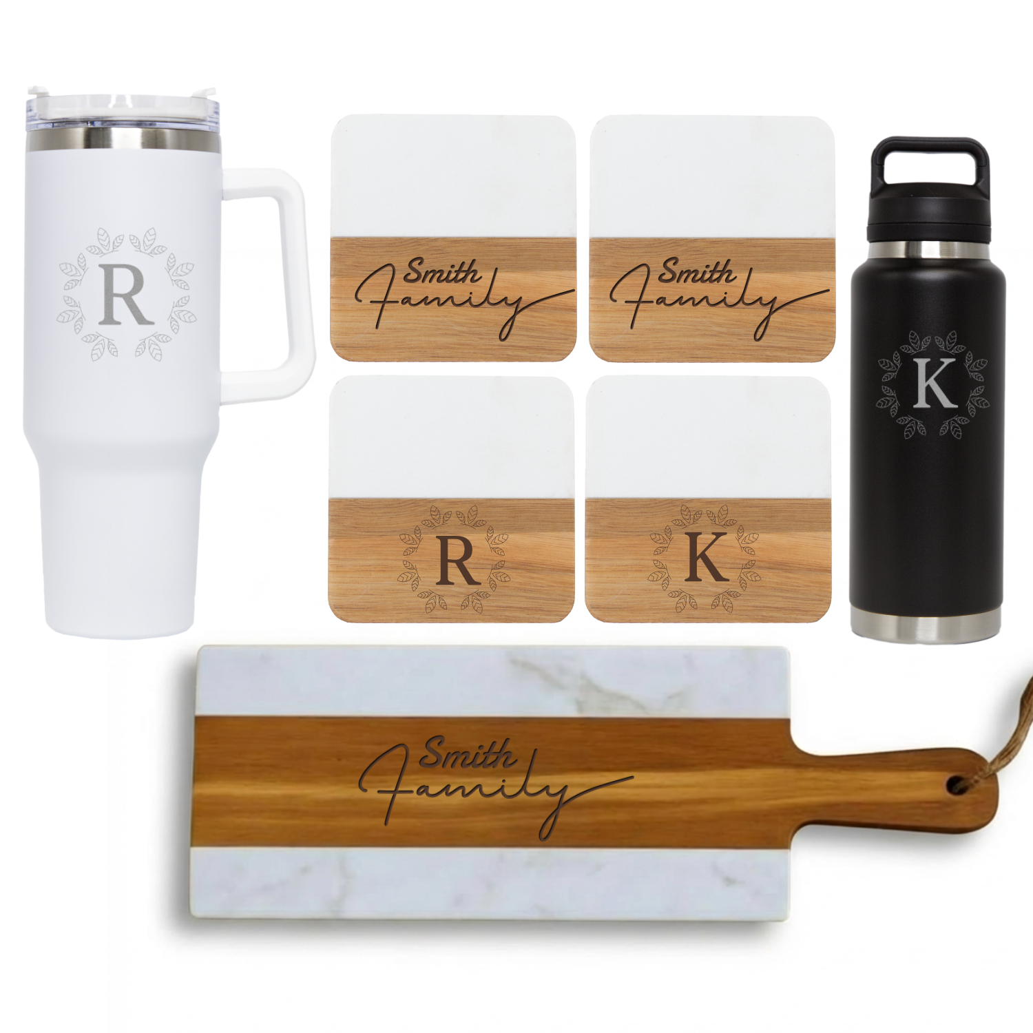 Gather the crew around with this charming marble cheeseboard set—the perfect blend of style and function for any occasion. This five-piece collection features a stunning marble board ideal for charcuterie spreads, paired with two matching coasters to protect your surfaces in style. Keep your beverages at the perfect temperature with the sleek black vacuum tumbler and crisp white travel mug, both ready for on-the-go sipping. Personalize your set with custom monogram engravings on the mug, tumbler, and coasters, adding that special touch that makes it uniquely yours. Whether you're hosting a dinner party or treating yourself, this versatile set brings elegance and practicality together.