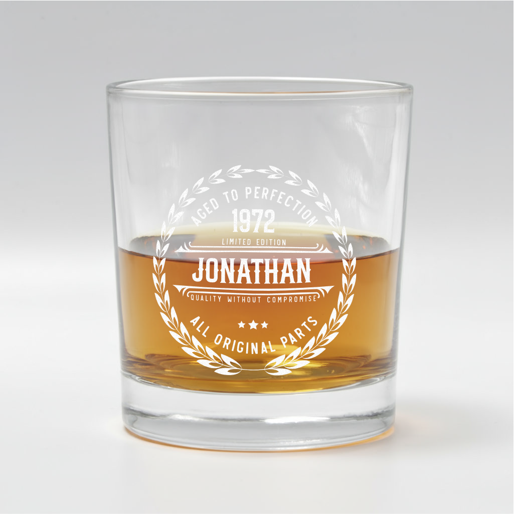 Celebrate another year with our Aged to Perfection Whiskey Glass—an 11 oz vessel crafted for those who appreciate quality spirits and thoughtful gestures. Personalize it with a name and birth date to create a truly distinctive birthday gift that honors the occasion. Each engraved detail transforms an everyday glass into a keepsake, perfect for whiskey enthusiasts, collectors, or anyone marking a milestone. Whether enjoyed neat or on the rocks, this personalized glass elevates the drinking experience while serving as a lasting reminder of the special day.