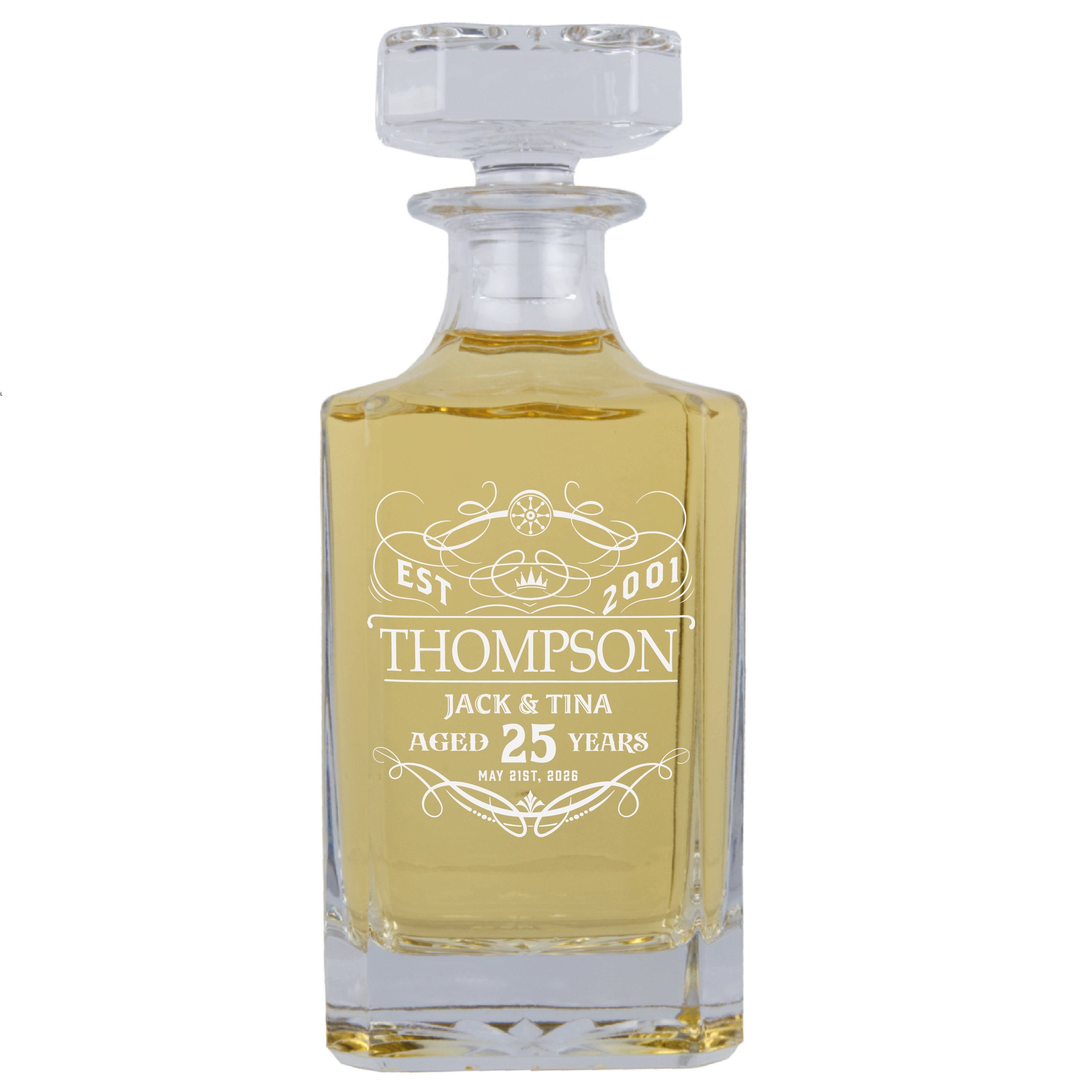Celebrate your milestone with this elegant custom whiskey decanter, expertly crafted to commemorate your unique love story. Personalize it with your names, anniversary year, and wedding date for a truly one-of-a-kind keepsake. The sophisticated square design complements any home bar or display shelf, while the premium glass construction ensures durability for years of cherished memories. Whether marking 25 years or beyond, this thoughtfully engraved piece makes an unforgettable anniversary gift that honors your journey together.