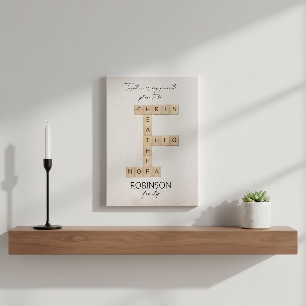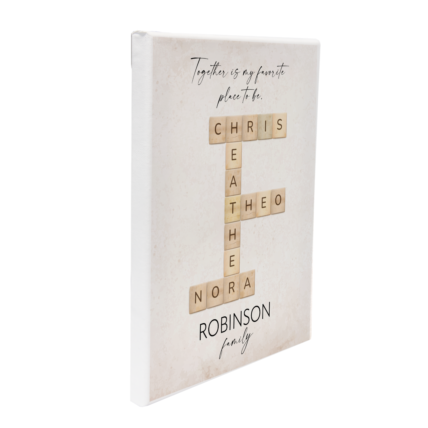 Bring your family’s names and favorite memories to life with our 8x10 personalized Family Word Puzzle canvas! Customize with first names arranged in a fun crossword-style design, add a photo, quote, or inspirational message, and create a unique keepsake for any room. Perfect for birthdays, anniversaries, home décor, or as a thoughtful gift for family and friends. Available ready-to-hang in portrait or landscape orientation.