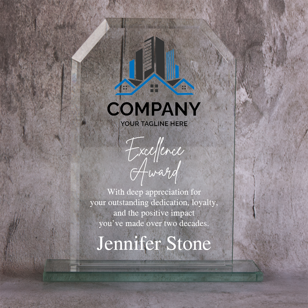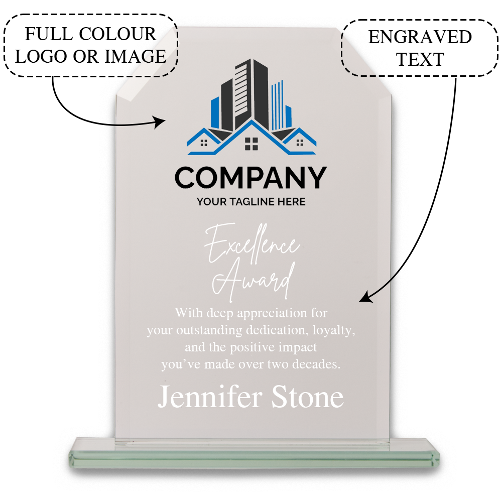 This award offers unique customisation: add your brand or emblem with full-colour logo printing for vivid detail, paired with engraved text for names, dates, or special messages. The combination of colour and engraving creates a professional, timeless look that elevates any recognition moment.