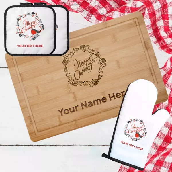 Personalized Christmas Bamboo Cutting Board, Oven Mitt & Pot Holder Set | Custom Holiday Kitchen Gift