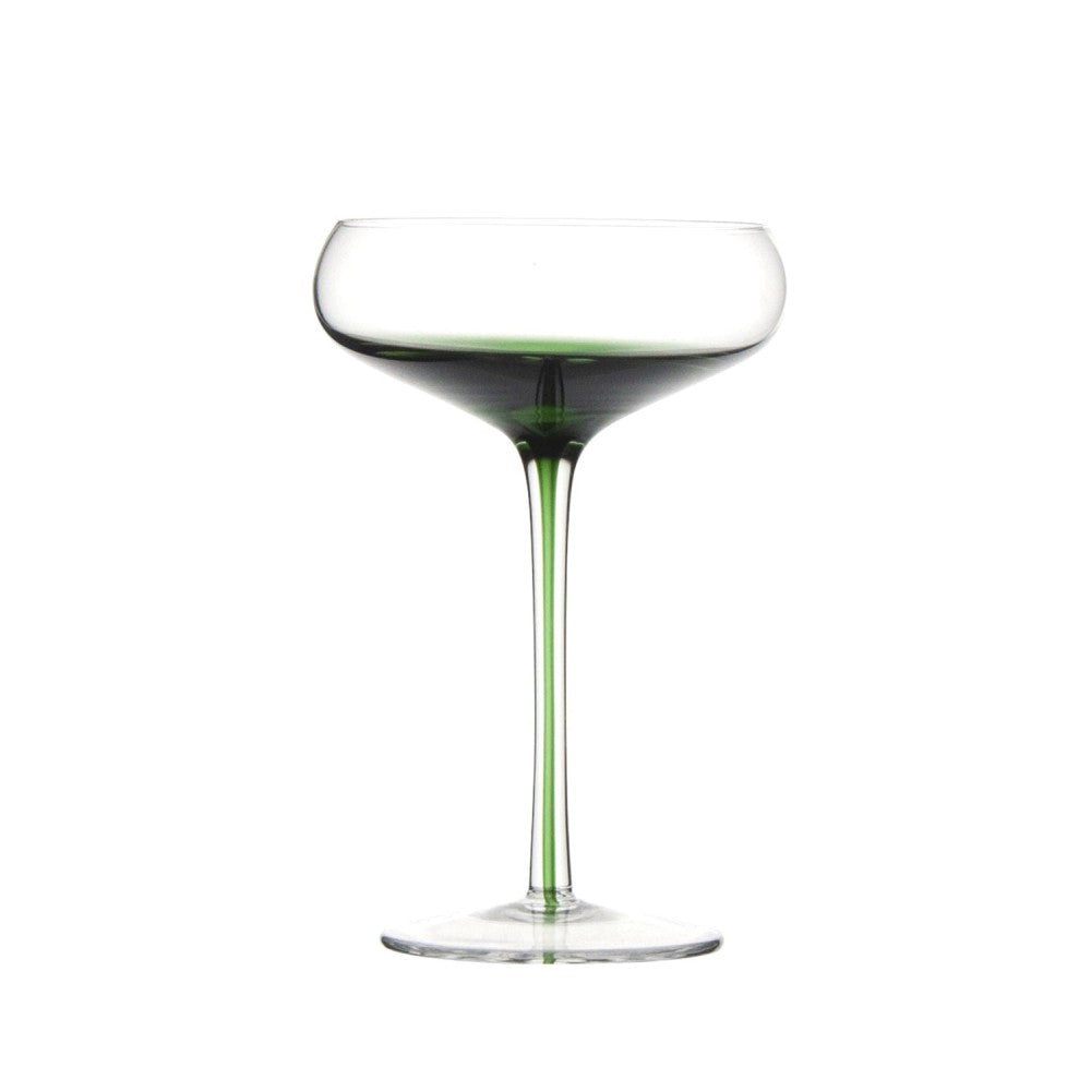 Available in emerald green, amber, and black, these coupe glasses are offered individually or as a set of four, perfect for gifting or hosting in style. The glassware is dishwasher safe, lead-free, and designed for lasting brilliance.