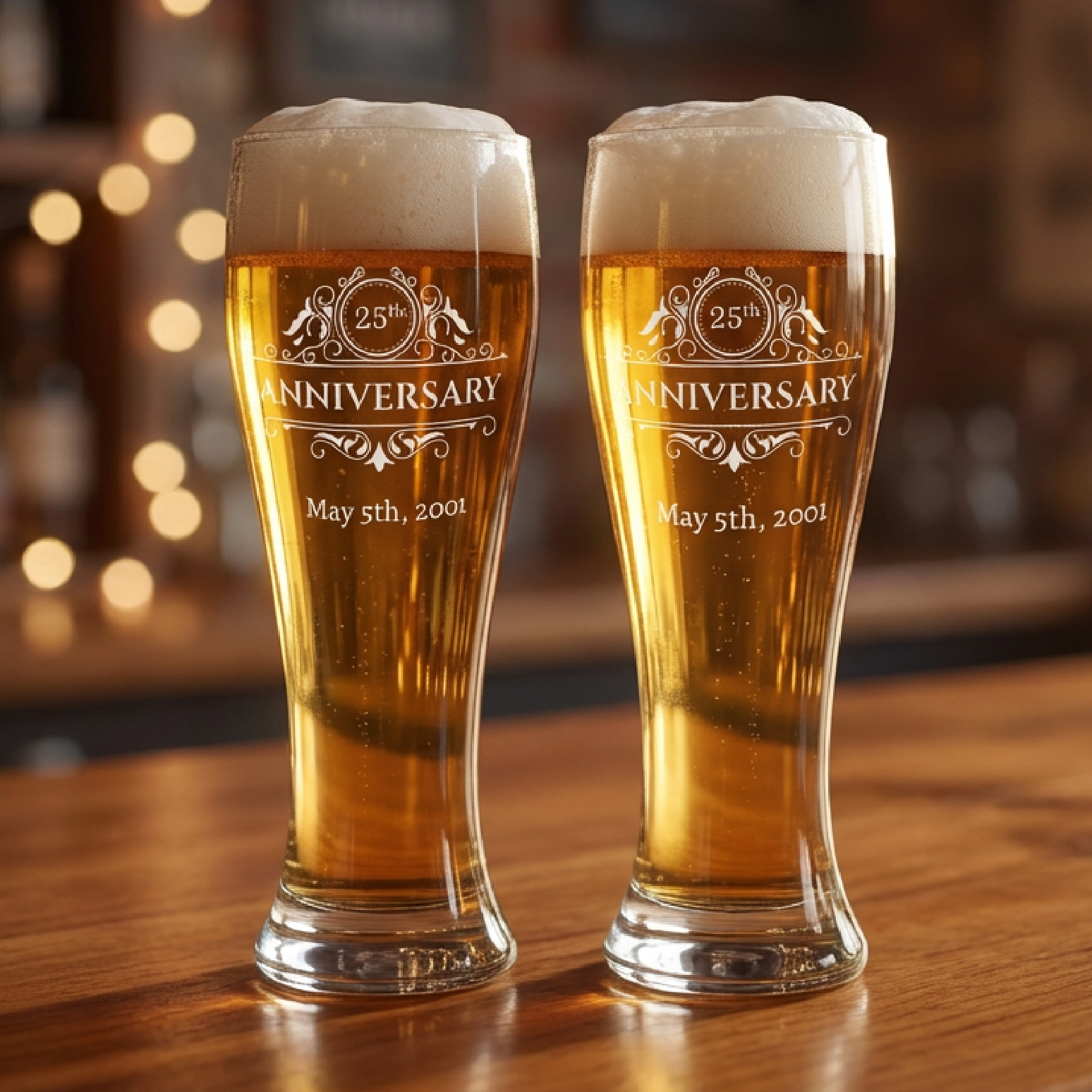 Celebrate your milestone in style with this charming pair of rounded pilsner glasses, perfect for toasting to years of togetherness. Customize each glass with your anniversary year—whether it's 5, 10, 25, or beyond—plus add a personal touch with your wedding date, names, or a meaningful message. Raise a glass to love, laughter, and all the memories you've made together. A thoughtful gift that turns everyday sips into special moments.