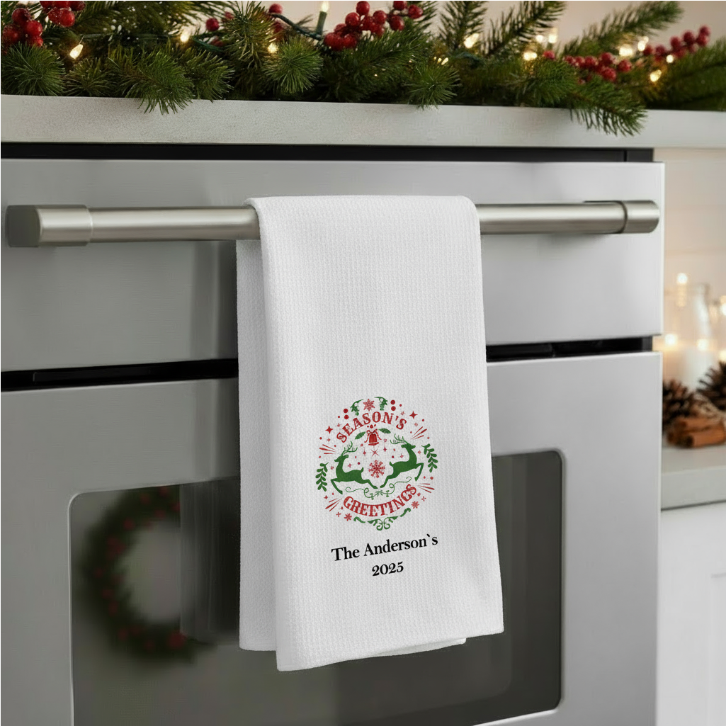 Personalized Season’s Greetings Dish Towel | Custom Printed Waffle Weave Kitchen Towel | Holiday Kitchen Gift