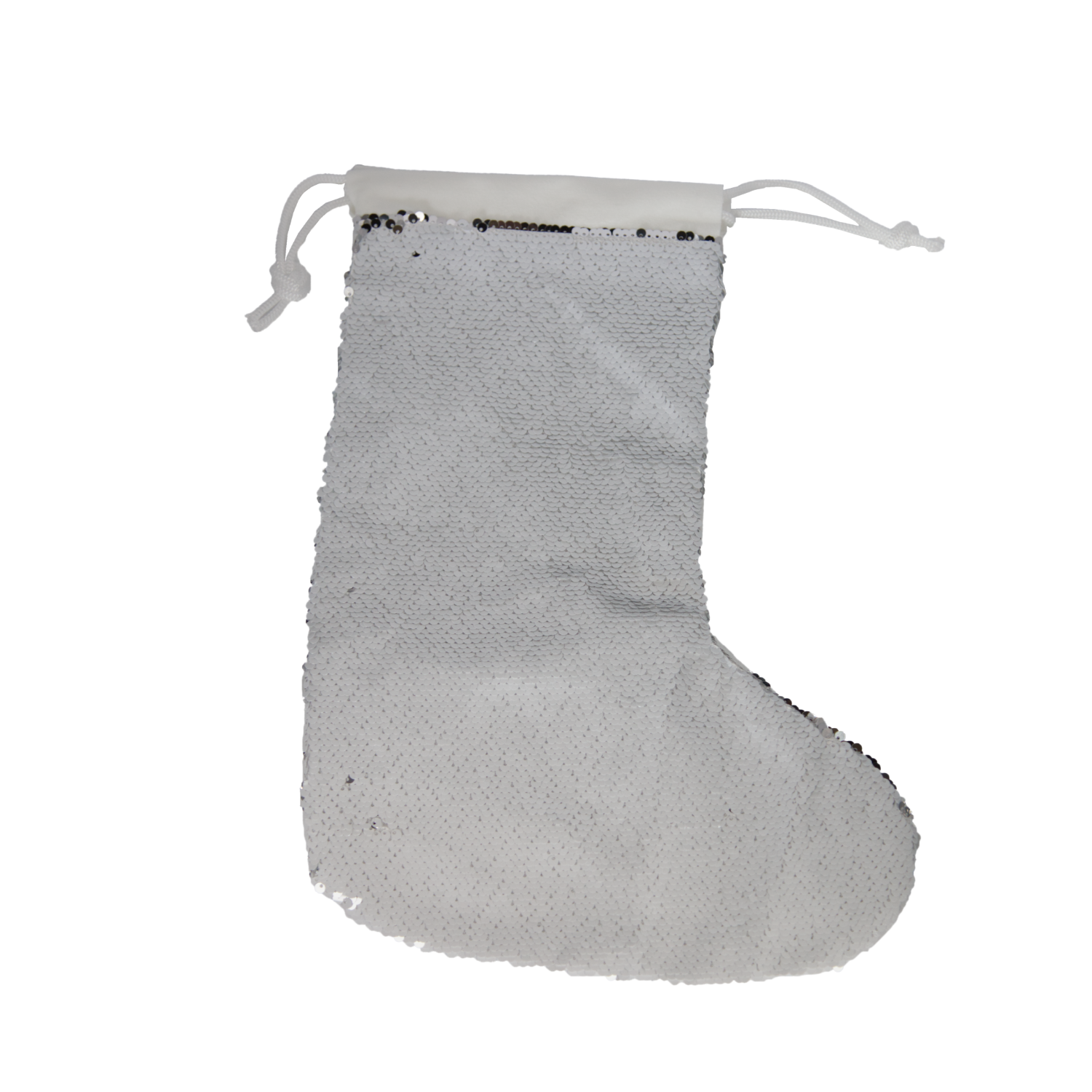Hang a silver sequin Christmas stocking by the fireplace and Santa will be sure to fill it up with some goodies! The stocking looks like a traditional Christmas stocking except it holds a hidden surprise! Add your favourite holiday photo and enjoy the looks on your loved ones' faces when you reveal your secret! Hang this stocking up on the fireplace mantel or anywhere else in the house, and you'll wake up on Christmas morning with a bunch of presents in your Christmas stocking! What a surprise! Personalize yours and order today! Measures 42x26 cm. Made of soft white velvet and features a white faux fur cuff. Attached to a loop that will allow easy hanging.