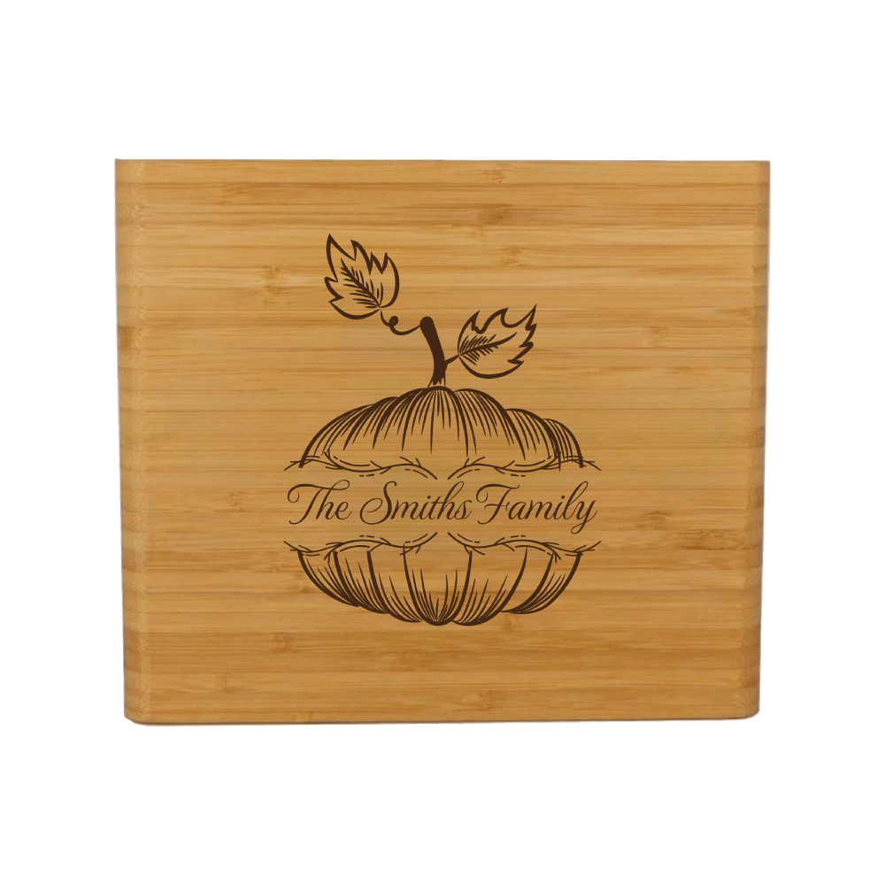 Celebrate the season of gratitude with our Thanksgiving Bamboo Cheese Board Set, featuring a charming pumpkin design and personalized family name engraving. Perfect for holiday entertaining, this eco-friendly set brings warmth, elegance, and functionality to your table. Ideal for Thanksgiving gatherings, Friendsgiving, or as a thoughtful hostess gift.