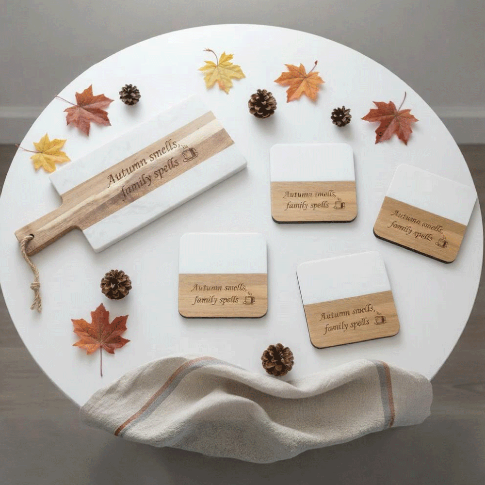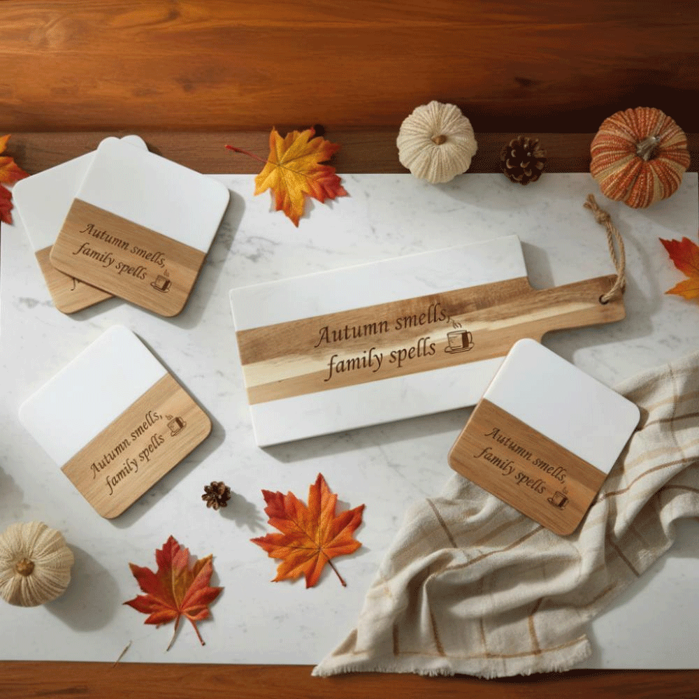 Add a festive, personalized touch to your holiday gatherings with this engraved marble serving board & coaster set—a lasting piece of Thanksgiving décor.